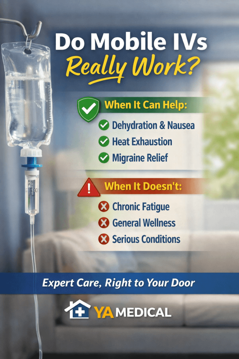 YA Medical provides mobile urgent care, telehealth urgent care, pediatric urgent care, and house call doctor visits across Phoenix, Scottsdale, Peoria, Tempe, Glendale, Cave Creek, Carefree, Mesa, Chandler, Surprise, Sun City, and Gilbert. Our licensed providers come directly to your home, office, gym, or hotel for convenient, same-day treatment — saving you hours compared to traditional clinics. We specialize in mobile IV therapy near me, IV hydration, dehydration IVs, immune and energy boost IVs, migraine IV therapy, and hangover IV drips, along with trigger point injections for muscle pain and tension relief. Whether you’re searching for urgent care near me, telehealth urgent care in Phoenix, or IV therapy near me, YA Medical delivers fast, professional care wherever you are in the Valley.
